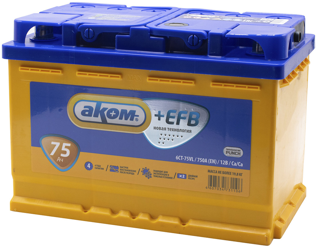 Аккумулятор AKOM +EFB — новейшая разработка завода «Аком» (г. Жигулёвск), созданная с применением технологии EFB. Благодаря усовершенствованной конструкции пластин, технологии PUNCH и улучшенному сепаратору, срок службы увеличен вдвое по сравнению с классическими аккумуляторами.