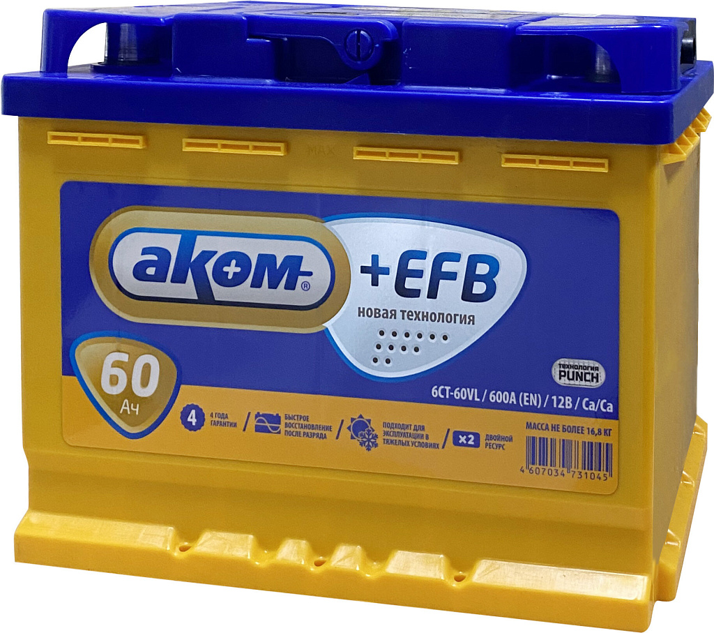 Аккумулятор AKOM +EFB 60 Ач 600 А прямая полярность