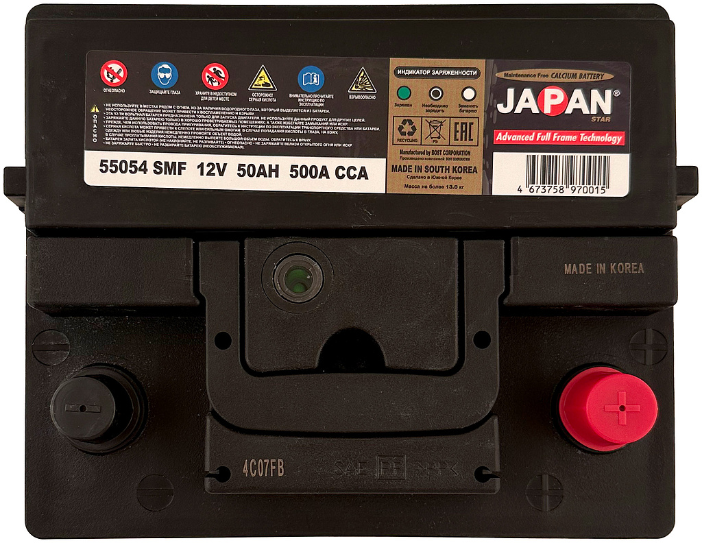 АКБ JAPAN STAR SMF — прочный и надёжный аккумулятор, который обеспечивает уверенный запуск двигателя и стабильную работу всех электрических систем автомобиля на протяжении многих лет.