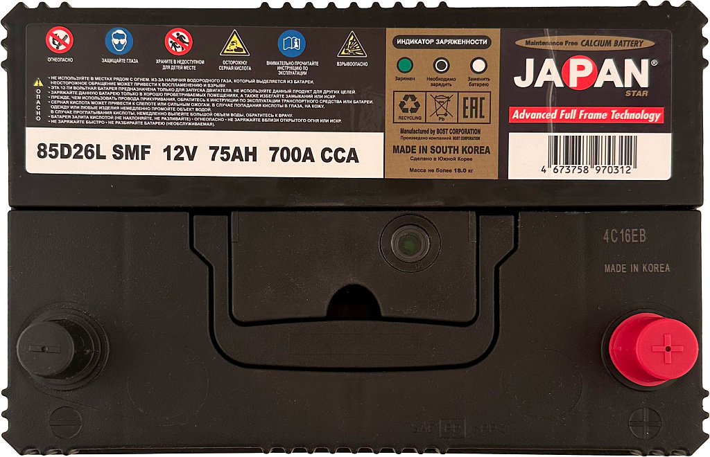 АКБ JAPAN STAR SMF — прочный и надёжный аккумулятор, который обеспечивает уверенный запуск двигателя и стабильную работу всех электрических систем автомобиля на протяжении многих лет.