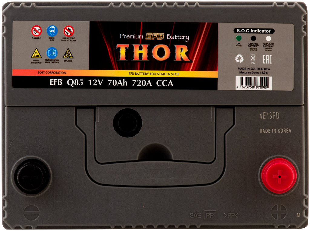 Аккумуляторы THOR EFB — это современная линейка, разработанная и произведённая компанией BOST CORPORATION (Южная Корея). Они предназначены для автомобилей, оснащённых системой Start-Stop, и отличаются повышенной устойчивостью к циклическим нагрузкам.