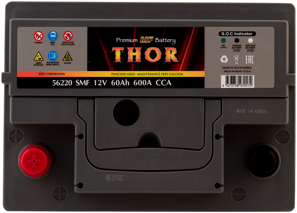 Автомобильный аккумулятор THOR SMF — серия аккумуляторов премиум-класса, выпускаемая заводом BOST CORPORATION (Южная Корея). Производитель применяет запатентованные технологии и материалы высокого качества, обеспечивая стабильную работу и продолжительный срок службы батарей.
