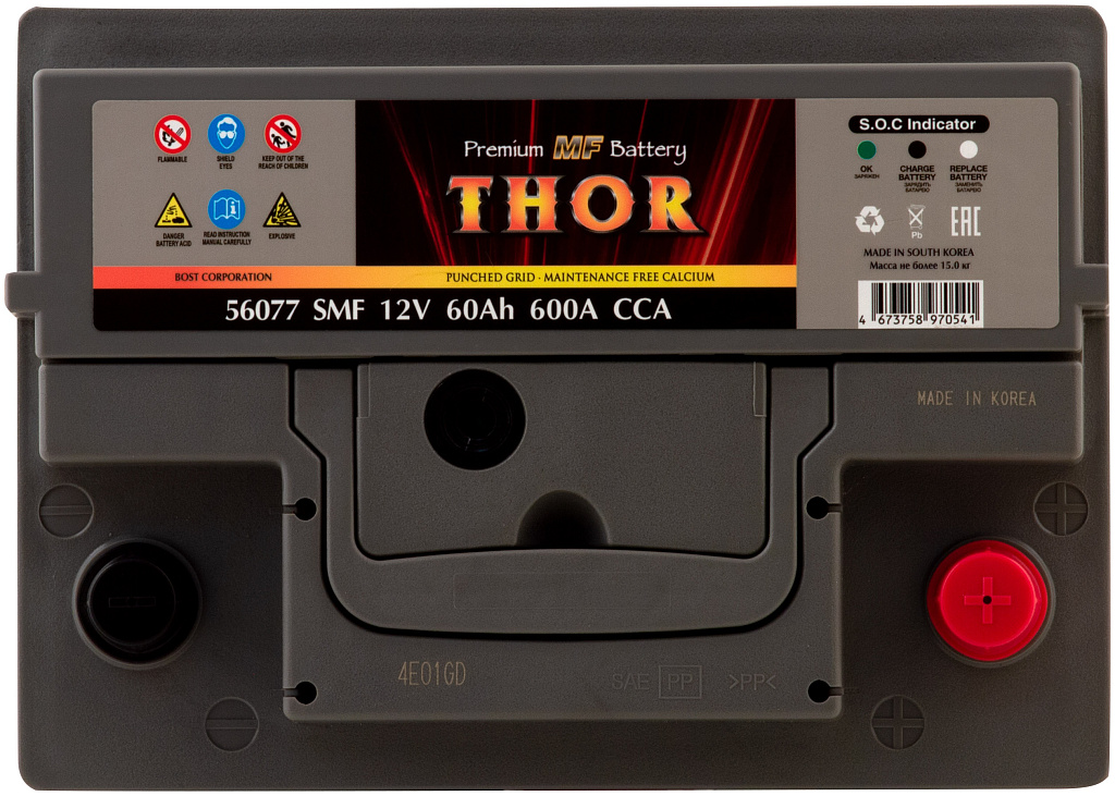 Автомобильный аккумулятор THOR SMF — серия аккумуляторов премиум-класса, выпускаемая заводом BOST CORPORATION (Южная Корея). Производитель применяет запатентованные технологии и материалы высокого качества, обеспечивая стабильную работу и продолжительный срок службы батарей.