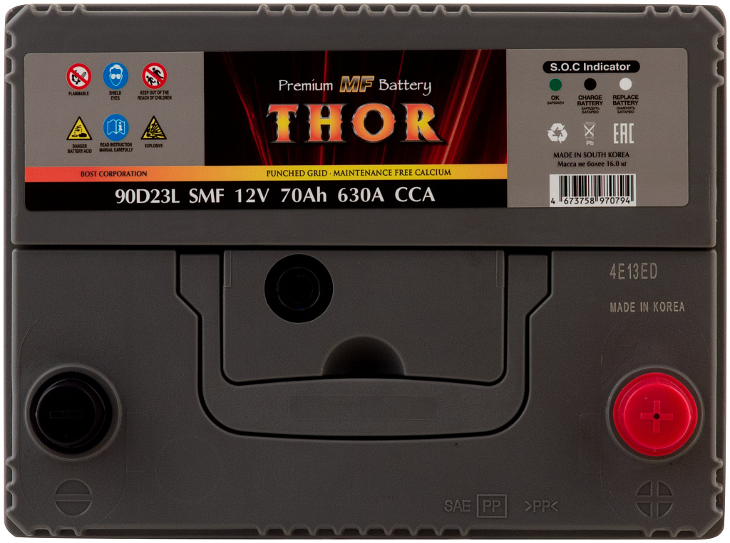 Автомобильный аккумулятор THOR SMF — серия аккумуляторов премиум-класса, выпускаемая заводом BOST CORPORATION (Южная Корея). Производитель применяет запатентованные технологии и материалы высокого качества, обеспечивая стабильную работу и продолжительный срок службы батарей.