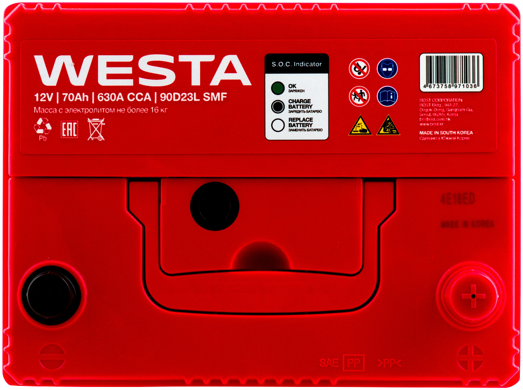 Аккумуляторы WESTA Korea SMF производятся на заводе BOST CORPORATION в Южной Корее с использованием новейших технологий и материалов премиум-класса. Эти батареи предназначены для большинства современных бензиновых и дизельных легковых автомобилей. Благодаря своей конструкции и технологии изготовления они обеспечивают надежное питание всех современных бортовых электроприборов.