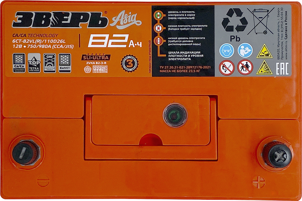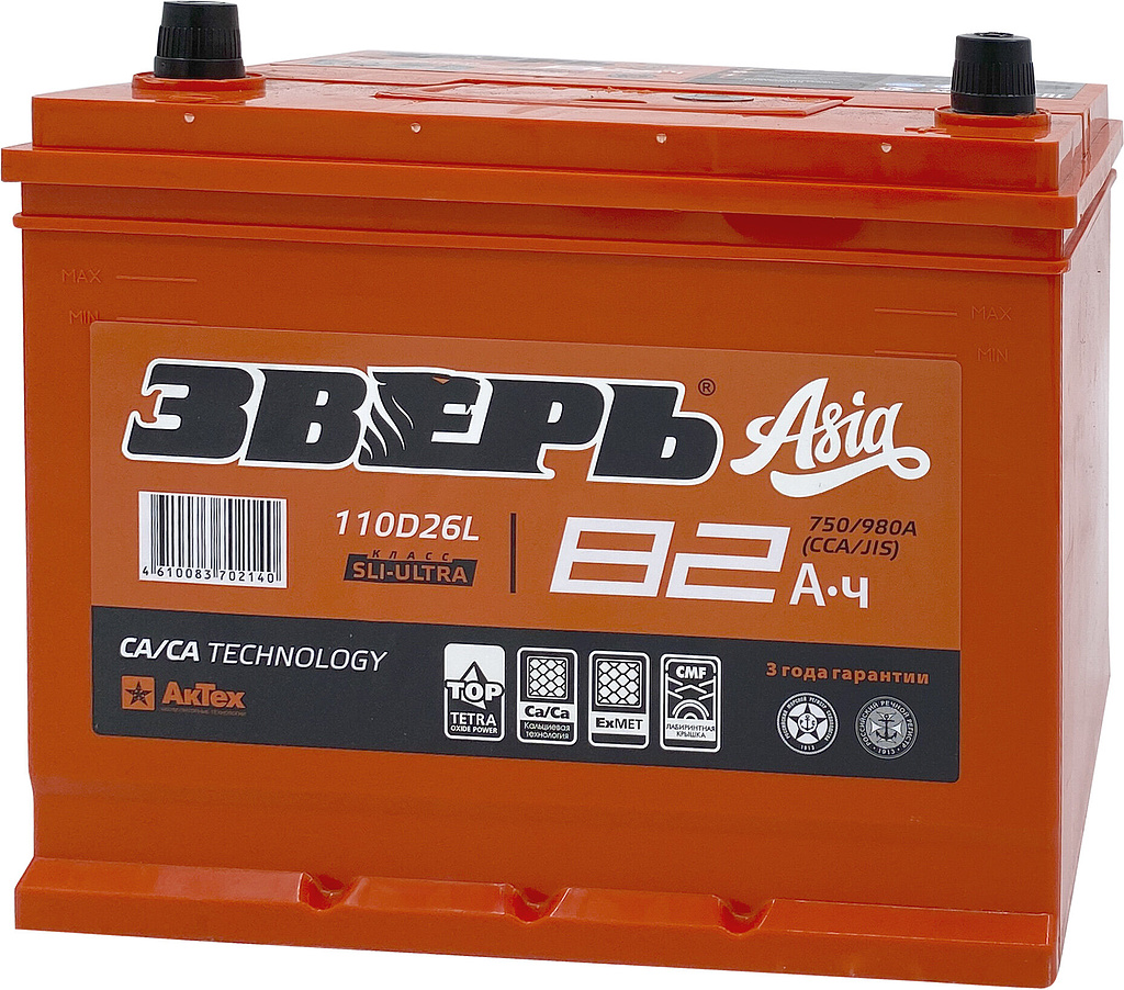 Аккумулятор ЗВЕРЬ Asia 82 Ач 750 А обратная полярность