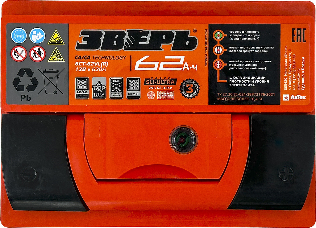 Аккумулятор ЗВЕРЬ 62 Ач 620 А обратная полярность